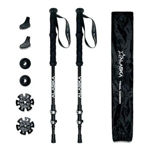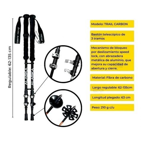 •Producto vendido por par.•Constituido en 3 tramos•Sistema de cierre: speed lock•Largo regulable: 62-135cm•Diámetro tramos: 16-14-12 mm•Longitud plegado: 63 cm•Peso: 210 g c/u- 420 g x par•Material: Fibra de carbono•Grip: EVA termoformada•Color: negro•Incluye: rosetas de arena, rosetas de nieve y punteras de tierra y punteras de cemento.